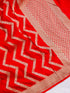 A striking handwoven red kataan silk dupatta, featuring an intricate chevron pattern across its lustrous body. The rich silk weave enhances the design’s depth and sheen, giving it a contemporary edge while retaining traditional elegance. Perfect for festive occasions or to elevate everyday ensembles with timeless sophistication.