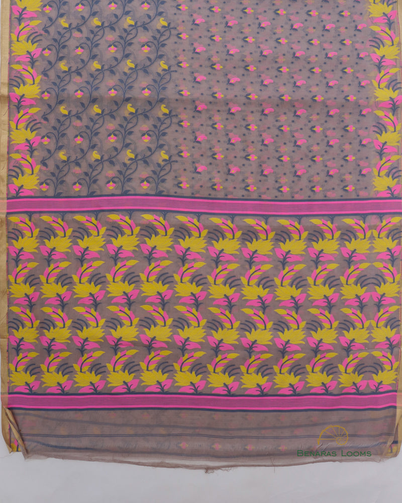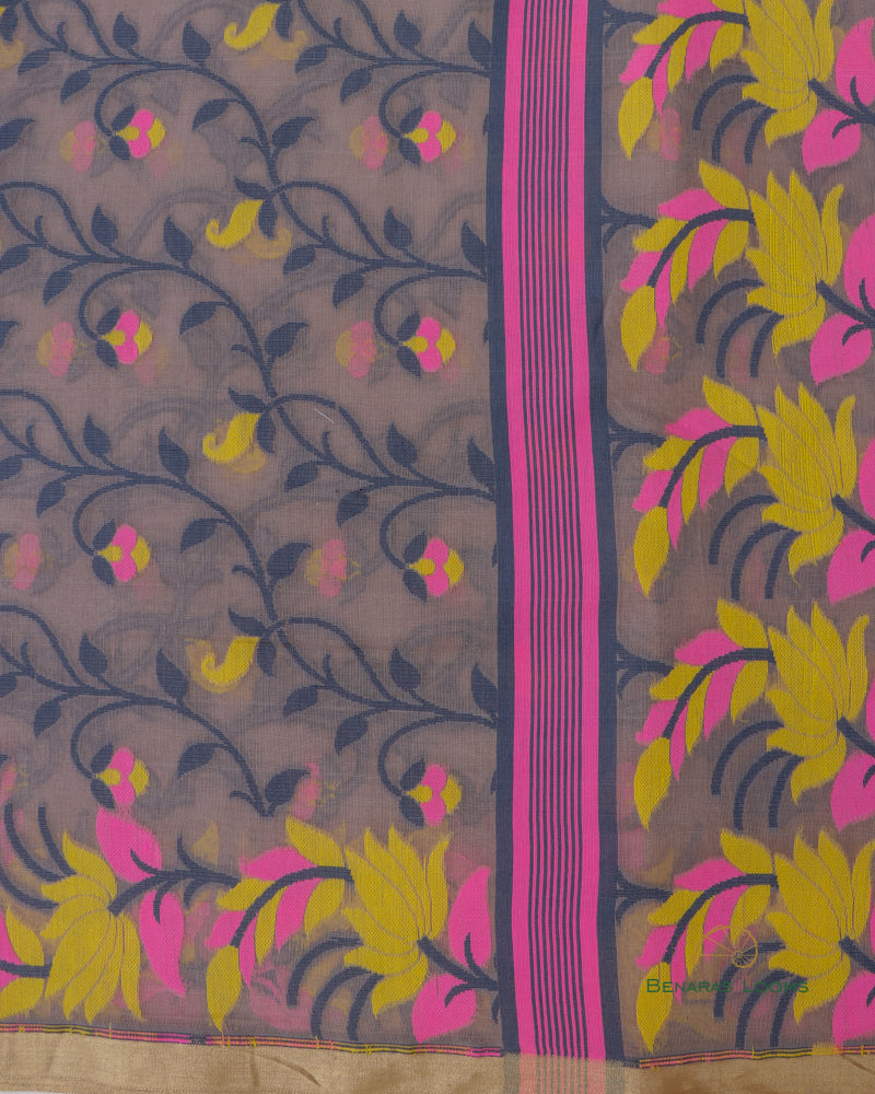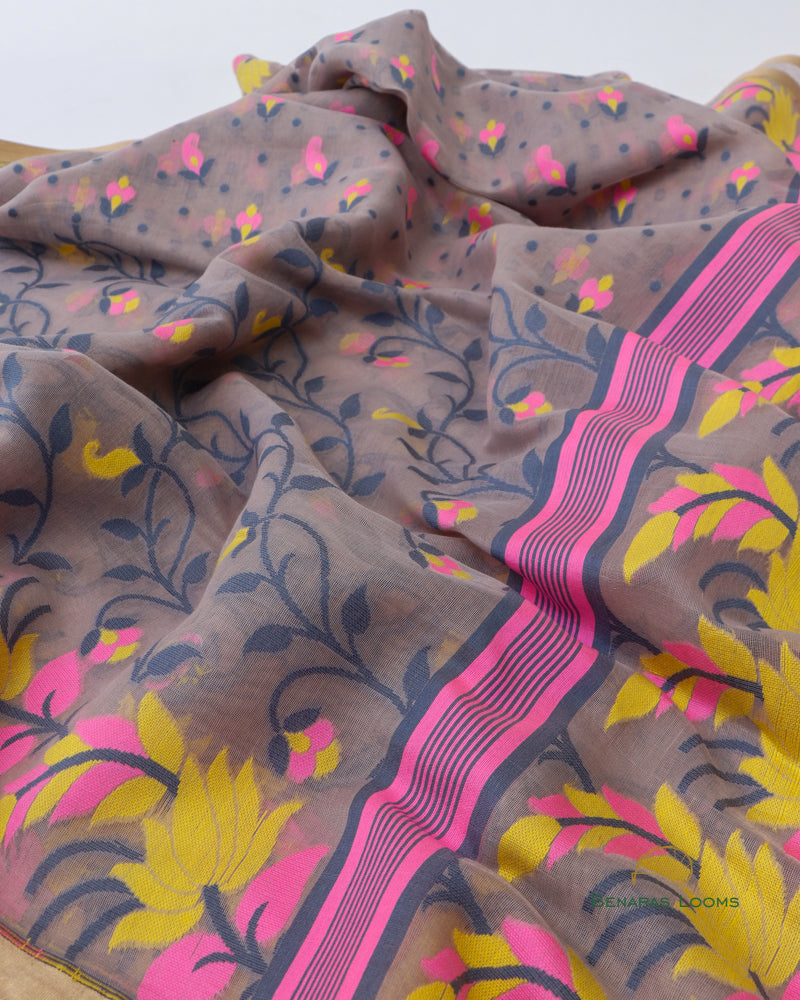 A fine muslin textile with Bangladeshi origin, Jamdani sarees are soft, lightweight and airy. This cutwork saree has been enhanced by weaving the motifs together on cotton silk that makes it a very comfortable drape for your everyday running errands or daily commute or hosting an ethnic function at home. The dainty pink motifs uplift the mood of the wearer and the saree should be teamed up with pearl ear drops and a nude lipstick.