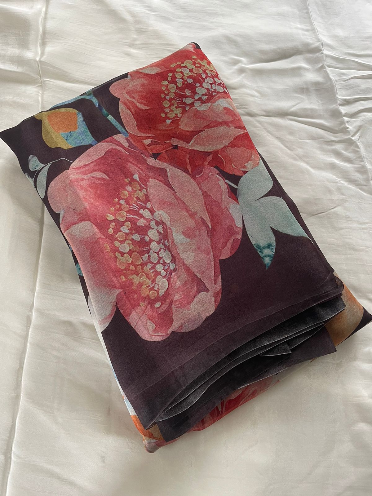 This saree has a satin body that wraps around easily with easy to make pleats and a beautiful organza pallu.The blouse is also printed satin.